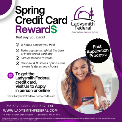 Ladysmith Federal is bringing fresh value to your wallet this spring with its in-house credit card, designed to reward you every time you spend. Cardholders can enjoy earning cash back on everyday purchases while keeping their finances close to home.