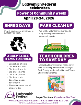 Ladysmith Federal staff will be visiting local schools to read to K–2nd grade students and teach them the importance of saving money, helping build strong financial habits early on.