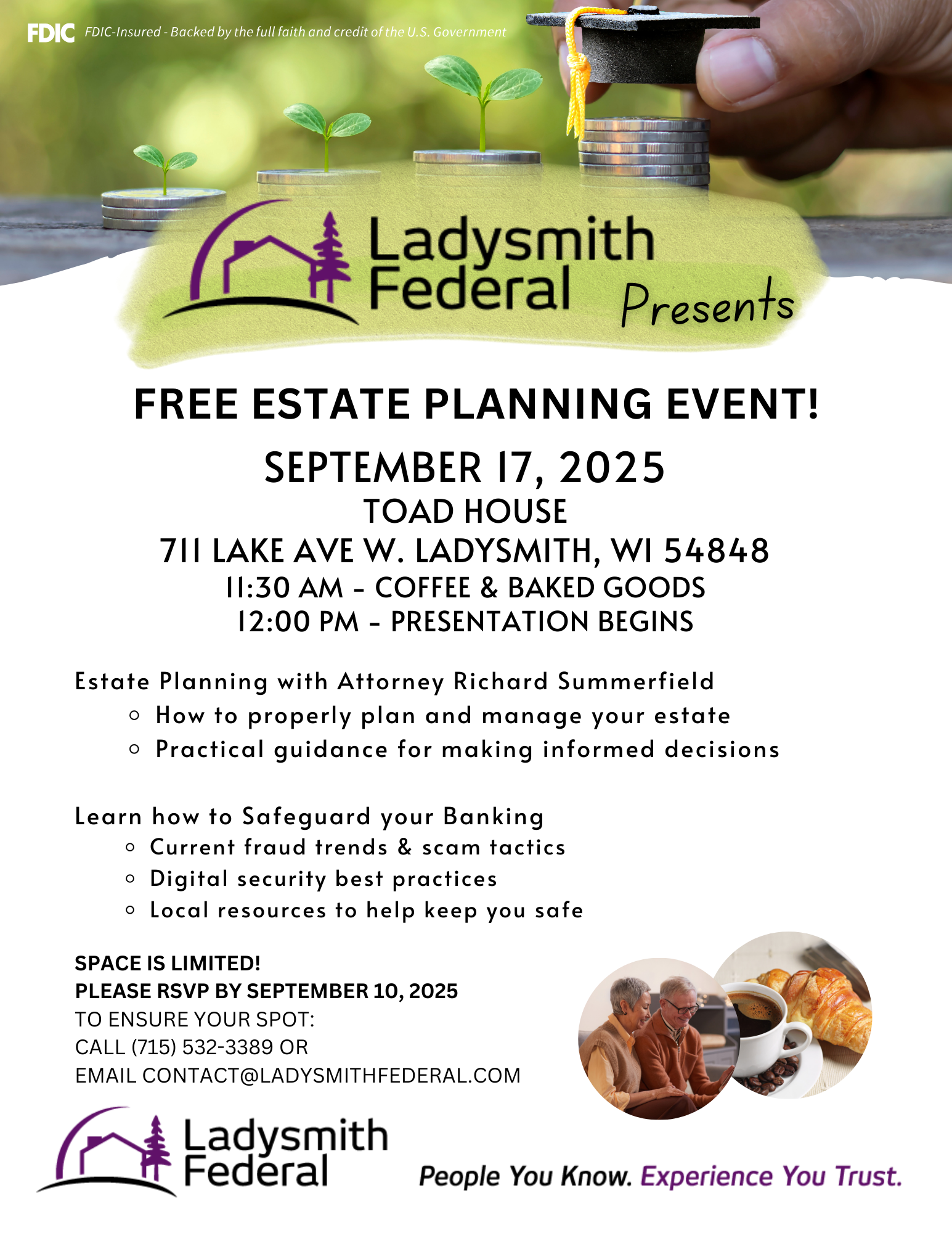 Stop in today to get started or ask questions—no appointment needed. At Ladysmith Federal, we’re committed to making banking more accessible, convenient, and personal.