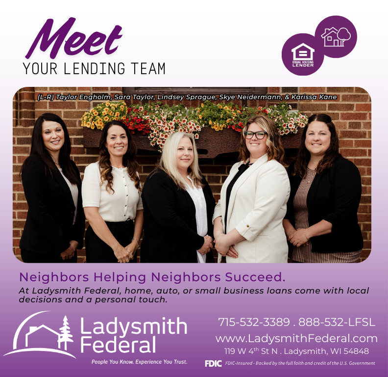 2024 marks our 90th anniversary at Ladysmith Federal. We have been servicing Ladysmith and Rusk County since 1934 and today we remain Rusk County's only locally-owned financial institution. In 2023, we ranked #1 as Rusk County's top mortgage lender and hope to remain a leader in 2024. We continue to give back to our communities though volunteer and financial contributions. We awarded 8 scholarships to graduating seniors at all four area high schools and contributed to the Ladysmith and Flambeau athletic departments HUDL cam programs.