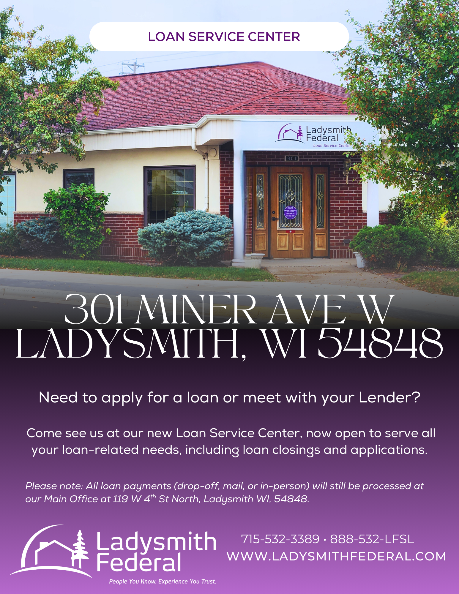 Thank you for your continued trust in us. We look forward to serving you at our new Loan Service Center location!